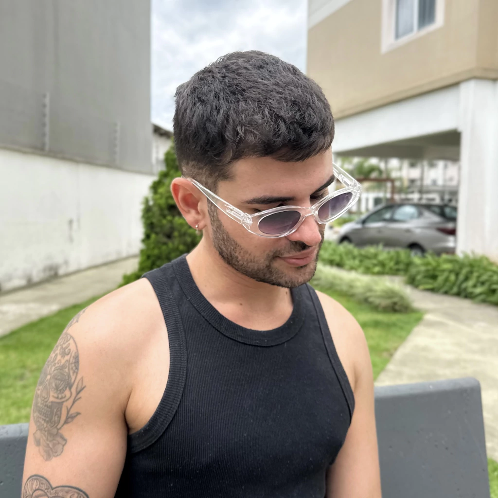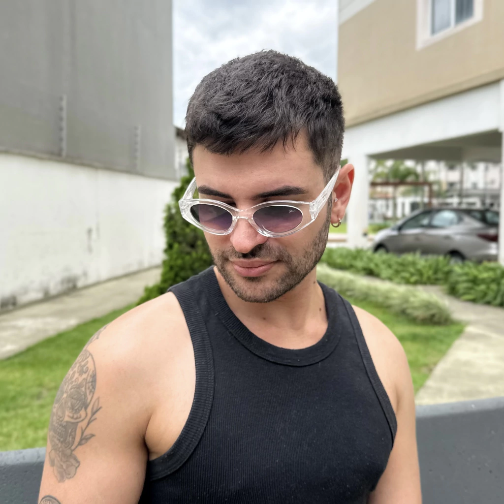 Armação em acetato toda transparente e super brilhosa, nosso modelo Vista é perfeito para deixar qualquer momento mais estiloso. Lende degradê perfeita. Dobradiças super flexiveis, o que facilita e deixa o encaixe no rosto perfeito. Possue proteção UV400 - Acompanha case em veludo super protetora personalizada e flanela.
